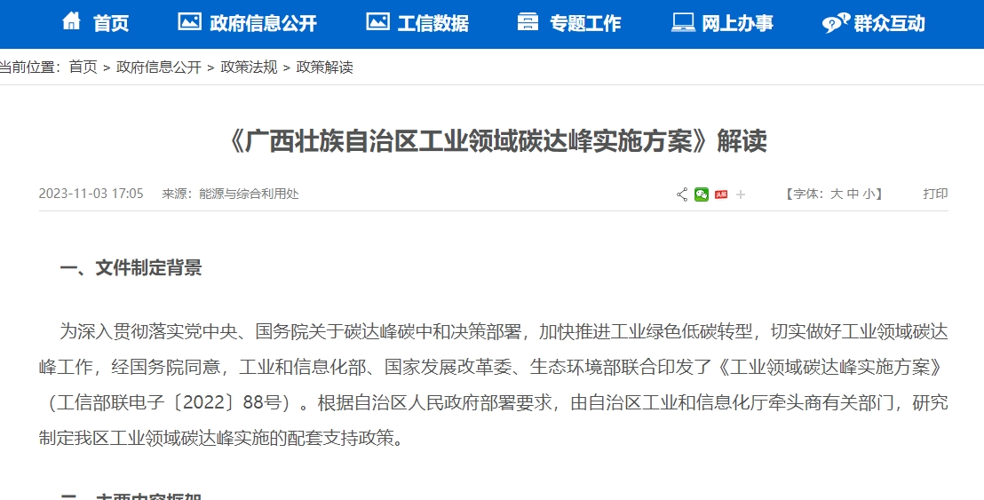 近日,廣西壯族自治區(qū)工業(yè)和信息化廳與廣西壯族自治區(qū)發(fā)展和改革委員會、廣西壯族自治區(qū)生態(tài)環(huán)境廳聯(lián)合印發(fā)了《廣西壯族自治區(qū)工業(yè)領(lǐng)域碳達(dá)峰實(shí)施方案》