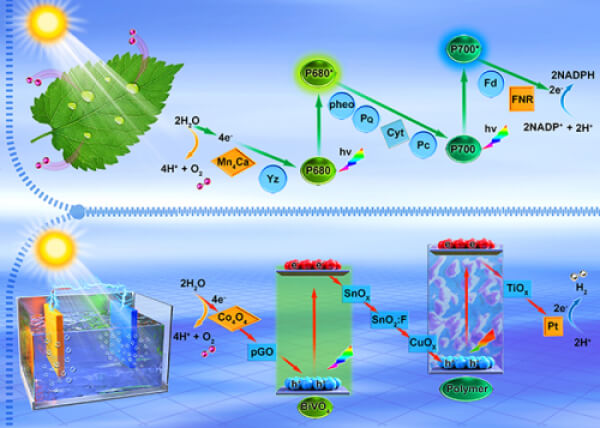 研究中,團隊基于自然光合作用的原理,采用多介質調控策略,以自然光合作用Z機制為靈感,實現高效光電催化全分解水過程,該團隊通過將無機氧化物基光陽極 (BiVO4) 和有機聚合物基光電陰極 (PBDB-T:ITIC:PC71BM) 與多種電荷傳輸介質耦合,組裝了一種高效的無偏全分離水光電化學池。研究發現,體系中有機聚合物的離散能級特性,使得有機光電陰極和無機光電陽極的光譜吸收具有很好的互補性,大大提高了太陽能的利用率。此外,該系統在光收集材料和電子受體/供體之間構建了包含多種電荷傳輸介質的仿生電荷傳輸鏈。在電化學勢梯度的驅動下,光生電子通過這些電荷傳輸介質有效轉移,提高了電荷轉移率,降低了電荷復合率,實現了高效的電荷分離和轉移。結果,太陽能-氫(STH)轉換效率達到4.3%。該研究通過使用具有匹配能級的多媒體調控的仿生策略,為高效人工光合系統的合理設計和組裝提供了新的思路和有效的方法。